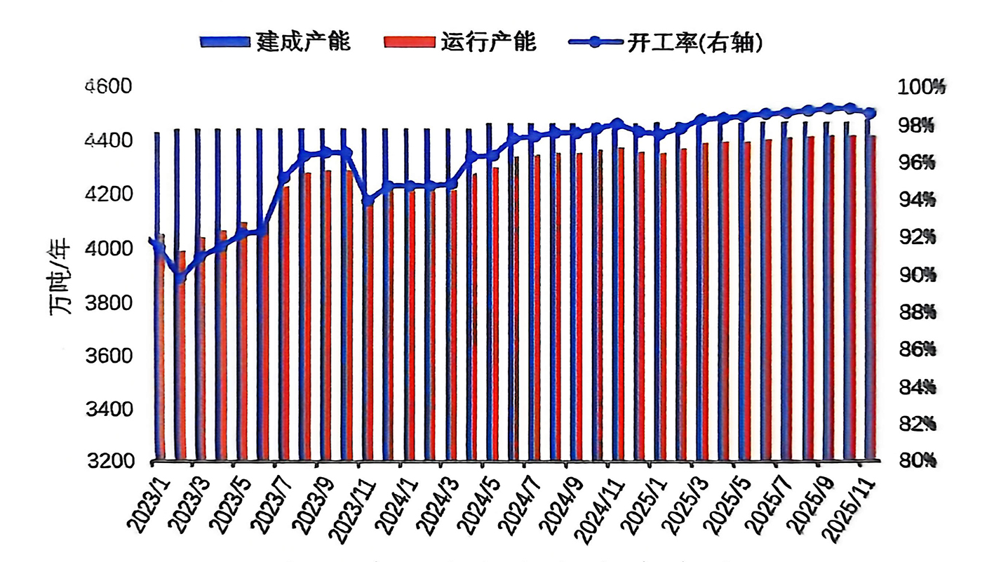 2025年11月,國內(nèi)電解鋁生產(chǎn)能力高位平穩(wěn)增長。截至11月底,建成產(chǎn)能4483萬噸/年,運行產(chǎn)能4421萬噸/年,環(huán)比增加1萬噸/年,總體生產(chǎn)力穩(wěn)定,生產(chǎn)布局仍在穩(wěn)步推進。2025年11月20日,新疆維吾爾自治區(qū)工業(yè)和信息化廳發(fā)布了新疆其亞鋁電有限公司21萬噸電解鋁建設(shè)項目產(chǎn)能置換方案的公告。該項目位于新疆準東經(jīng)濟技術(shù)開發(fā)區(qū)環(huán)城西路451號,槽型為預計500kA*156臺,產(chǎn)能指標來自新疆其亞鋁電有限公司,擬于2025年11月開工,2026年12月建成投產(chǎn)。11月26日,天山鋁業(yè)140萬噸電解鋁綠色低碳能效提升改造項目首批120臺電解槽正式開始通電啟槽,為未來140萬噸/年產(chǎn)能滿產(chǎn)運行奠定堅實基礎(chǔ)。扎鋁二期35萬噸/年計劃于12月20日通電,該項目是國家電投集團打造“源網(wǎng)荷儲直供”新范式的標志性工程,采用500kA電解槽技術(shù),2026年全面達產(chǎn),投產(chǎn)后綠電占比將達80%。預計2025年底建成產(chǎn)能將達到4525萬噸/年。目前,在產(chǎn)能接近“天花板”和開工率始終維持98%以上的背景下,后續(xù)產(chǎn)量和產(chǎn)能的增長空間非常有限。