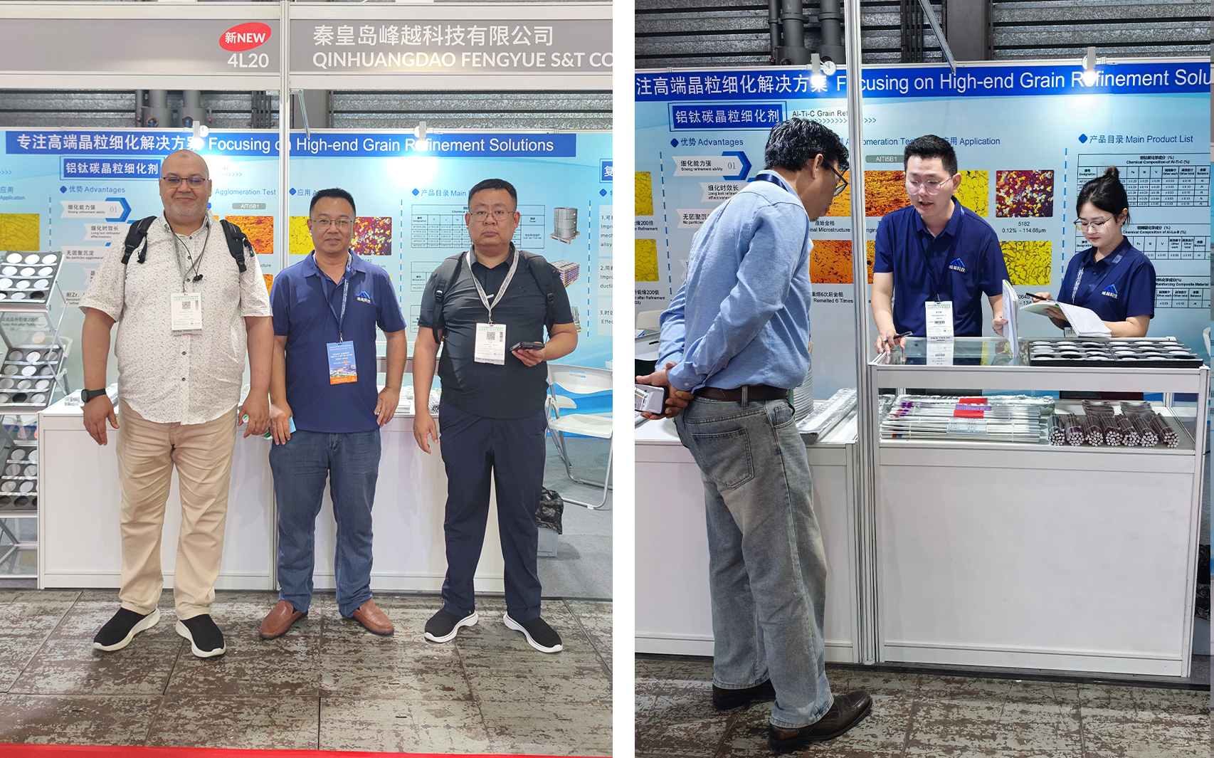 峰越科技此次重點展示了自主研發(fā)的鋁鑭硼(AlLa3B1.5)晶粒細(xì)化劑、6% TiC 顆粒增強復(fù)合材料和鋁鈦碳鈧(AlTi5C0.2Sc)晶粒細(xì)化劑。